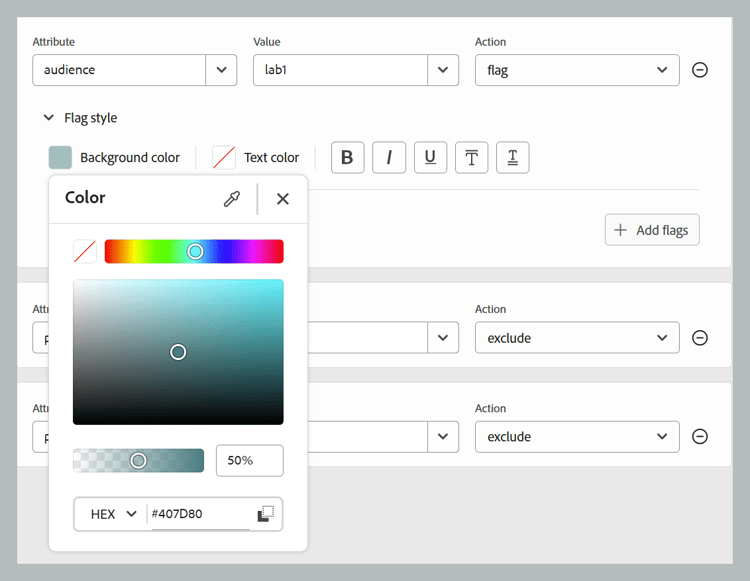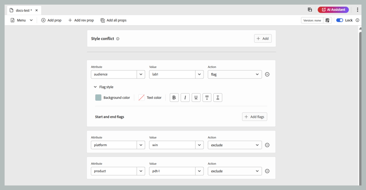 La segunda lista desplegable muestra los valores configurados para el atributo seleccionado. A continuación, la siguiente lista desplegable muestra las acciones que se pueden configurar en el atributo seleccionado. Los valores permitidos en la lista desplegable de acciones son: include, exclude, passthrough y flag. Para obtener más información sobre estos valores, vea la definición del elemento prop en la documentación DITA de OASIS. Para obtener detalles sobre la acción de las propiedades agregadas en los atributos, vea Acciones para la propiedad.