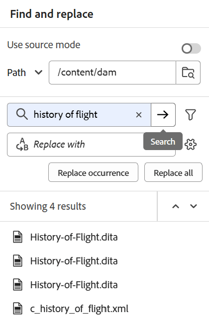 - Resultados de búsqueda con: busca texto en los archivos presentes en la ruta seleccionada del repositorio de Adobe Experience Manager. El texto se busca en el título, el nombre de archivo y el contenido de los archivos.