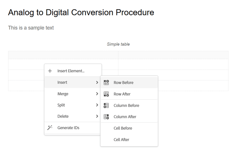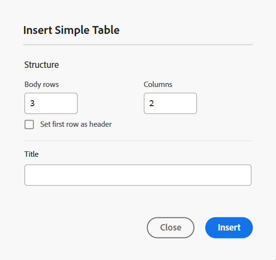 <simpletable> o <tgroup> según la configuración del Editor XML. Para obtener más información, vea Configurar la visualización de las tablas pegadas.Puede especificar el número de filas y columnas necesarias en la tabla. Si desea mantener la primera fila como encabezado de tabla, seleccione la opción Establecer la primera fila como encabezado. Para añadir un título a la tabla, introdúzcalo en el campo Título.