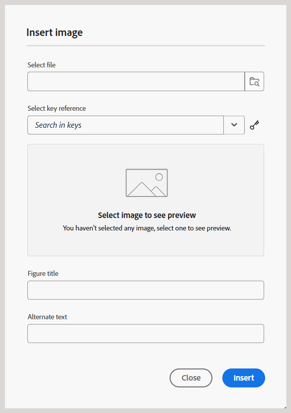 Puede agregar un título de imagen/figura y texto alternativo para la imagen en el cuadro de diálogo Insertar imagen.