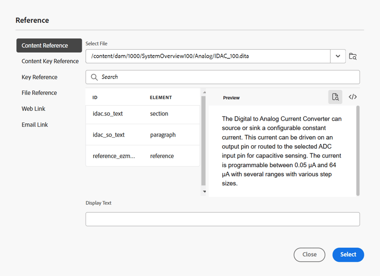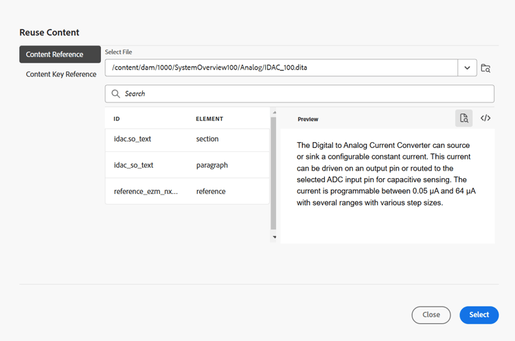 En el cuadro de diálogo Reutilizar contenido (Reuse Content), seleccione el fichero DITA para referencias de fichero o el fichero de mapa DITA que contiene las referencias de clave. Una vez seleccionado, el tema o las referencias clave se muestran en el cuadro de diálogo. Puede seleccionar la clave o el identificador del tema que desee insertar y seleccionar Listo para insertar el contenido en el tema.