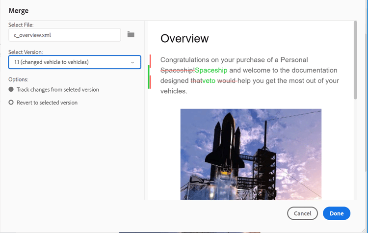 Rastrear cambios de la versión seleccionada: esta opción muestra todas las actualizaciones de contenido en forma de cambios rastreados. A continuación, puede elegir aceptar o rechazar los cambios del documento de uno en uno o todos en una sola vez.