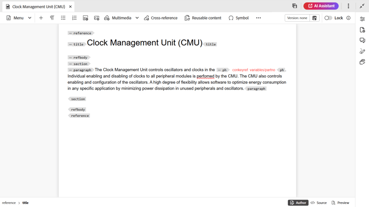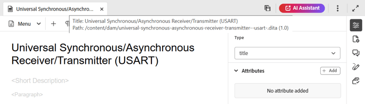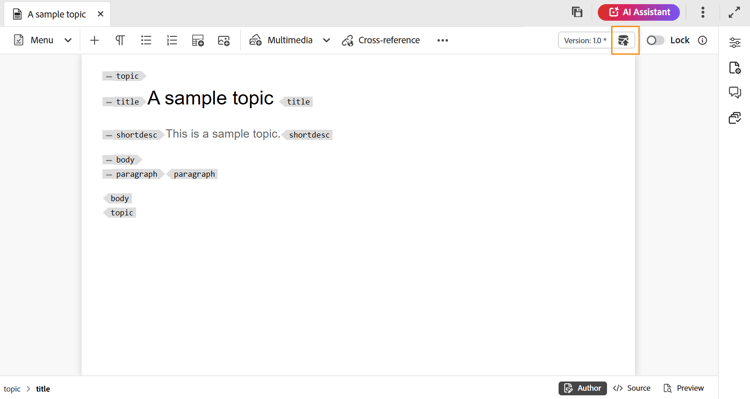 Etiquetas: La característica Etiquetas del Editor es un botón de alternancia que controla la visibilidad de los elementos DITA. Cuando está activada, muestra etiquetas estructurales dentro del contenido, lo que permite ver y gestionar los elementos DITA subyacentes de forma más eficaz. Cuando está desactivado, el editor oculta estas etiquetas, lo que proporciona un entorno de creación más limpio y centrado.
