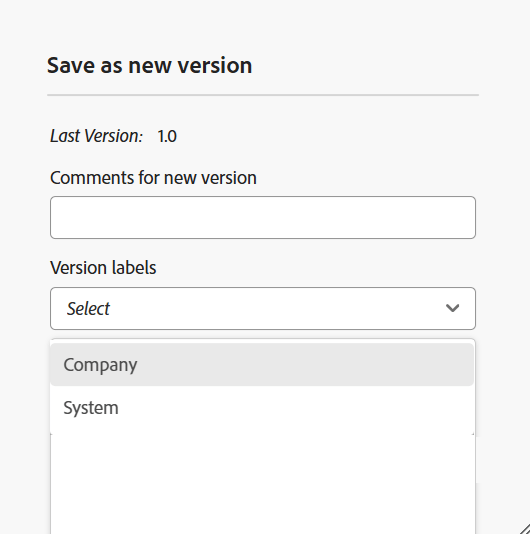 Si el administrador tiene etiquetas de versión preconfiguradas, verá esas etiquetas en una lista desplegable. Puede elegir una etiqueta de la lista de etiquetas disponibles y guardar el documento.
