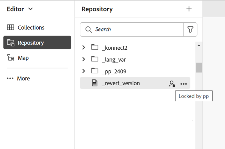 En el panel Repositorio, los archivos bloqueados se muestran con un icono de bloqueo. Cuando pasa el ratón por encima de este icono de bloqueo, el nombre de usuario o bloqueado por usted se muestra como información sobre herramientas.