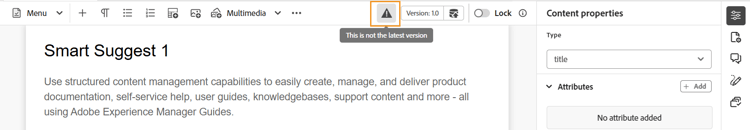 Al volver a una versión anterior, se muestra una señal visual que indica que la versión en la que está trabajando no es la más reciente.