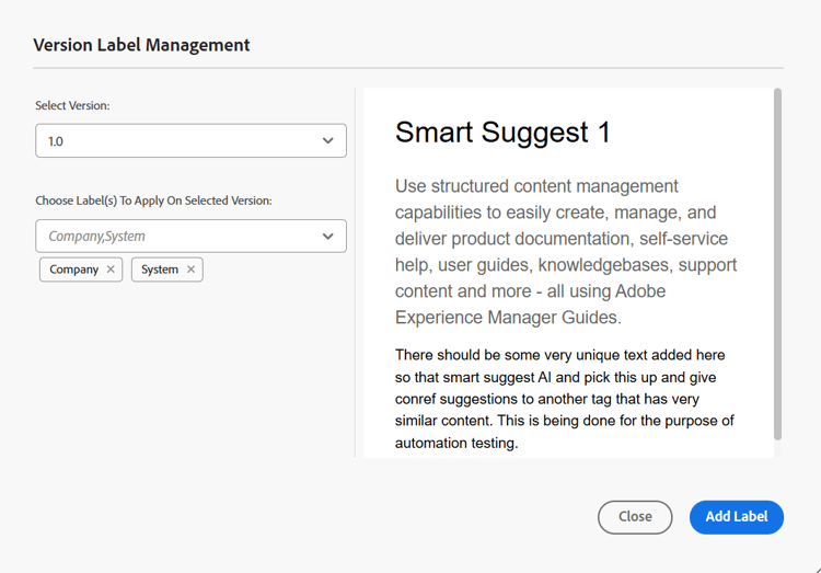 note note NOTE No se puede aplicar la misma etiqueta en varias versiones de un tema. Si intenta asociar una etiqueta existente, se le proporcionará una opción para eliminarla de la versión existente y aplicarla en la versión seleccionada del tema. -