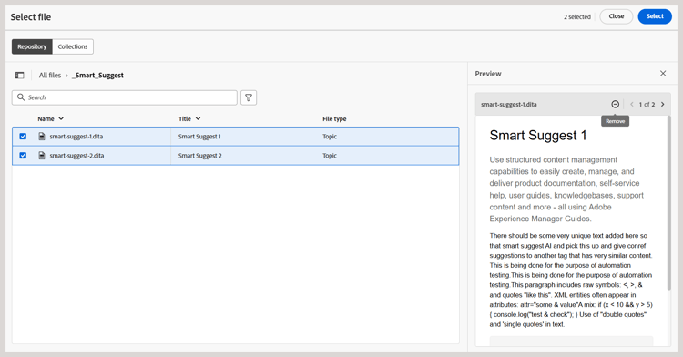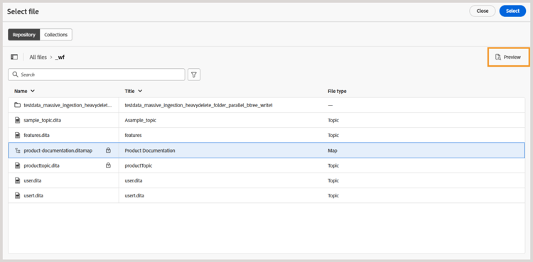 Actualmente, hay disponible una selección múltiple de archivos para contenido reutilizable, referencias de temas, Schematron, ajustes preestablecidos de salida (mediante DITAVAL) y Workfront.
