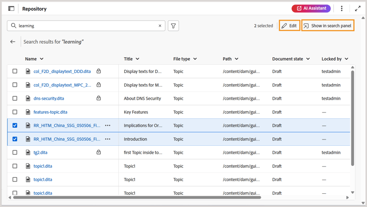 Una vez que aparezcan los resultados de la búsqueda, puede seleccionar varios archivos y abrirlos en el editor con el icono Editar, o trabajar con todos los resultados enviando los resultados de búsqueda al editor mediante la opción Mostrar en el panel de búsqueda.
