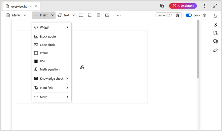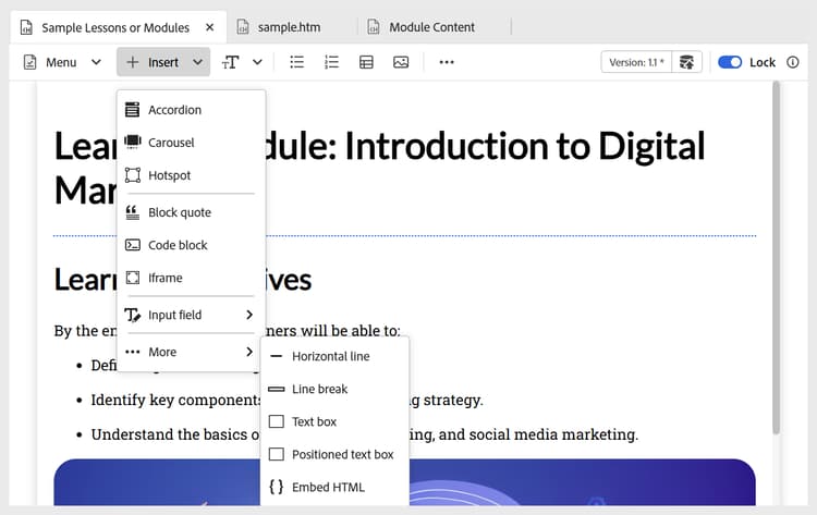 Más opciones: Tiene opciones adicionales para mejorar el contenido de aprendizaje, como insertar una línea horizontal, un salto de línea, un cuadro de texto, un cuadro de texto posicionado y HTML incrustado.