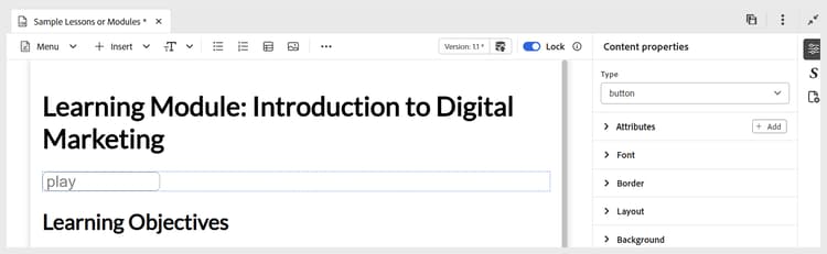 Campo de entrada: Agrega un campo de entrada de texto junto con un botón al contenido. Puede utilizar esta combinación para capturar los datos introducidos por el usuario y las acciones específicas del déclencheur. Se añade un botón de reproducción al contenido como se muestra a continuación.