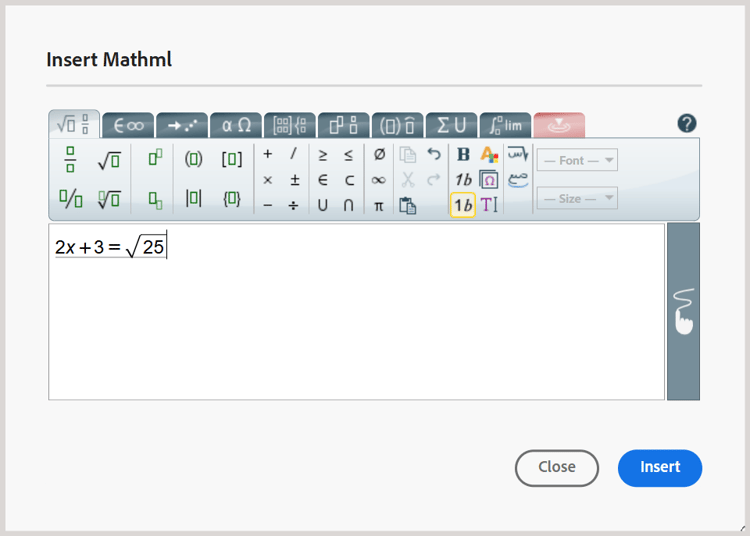 ecuación de MathML: inserta ecuaciones de MathML en el contenido. Puede crear una ecuación de MathML y seleccionar Insertar para agregarla al documento.