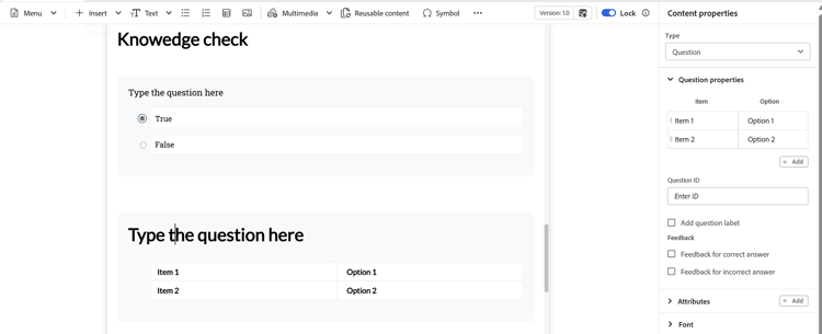 Puede configurar respuestas correctas y otros campos obligatorios a través del panel Propiedades del contenido. Para obtener más información, vea Tipos de preguntas. Puede añadir varios tipos de preguntas utilizando las opciones de comprobación de conocimientos como se muestra a continuación.
