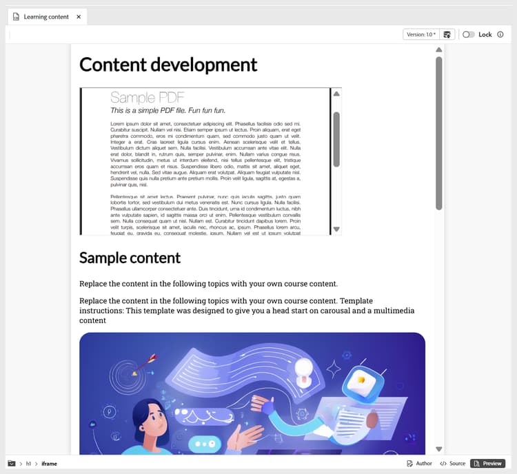 Iframes: inserta un iframe en el contenido para incrustar páginas web externas o recursos interactivos. Puede configurar las propiedades del iframe mediante el panel Propiedades del contenido, que incluye la dirección URL de origen, la anchura, la altura, la alineación y el título. Puede ver el contenido agregado en el iframe cambiando al modo Vista previa, como se muestra a continuación.