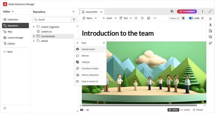 Si prefiere usar el contenido H5P de su sistema, primero cargue el archivo en DAM con la opción Cargar recursos y, a continuación, haga que forme parte de la vista de repositorio/Assets.