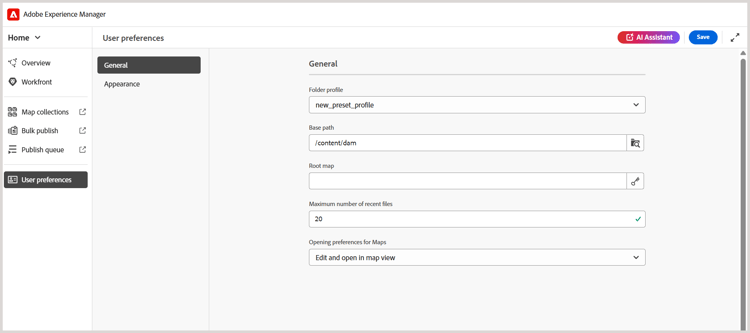Para empezar a usar la interfaz de usuario, primero debe configurar el perfil de carpeta y la ruta base correctos en la configuración de preferencias de usuario de la página principal de Experience Manager Guides.