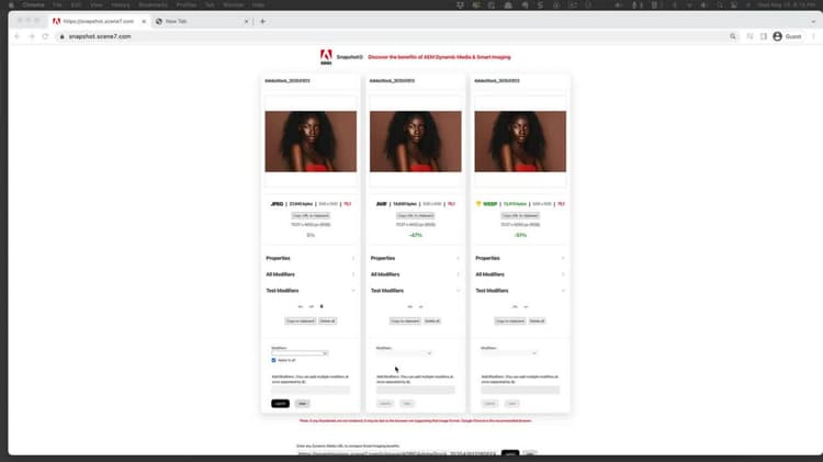 Instantánea de Adobe es una herramienta de demostración visual, diseñada para ilustrar la potencia de Dynamic Media para una entrega de imágenes optimizada y dinámica. Experimente con imágenes de prueba o URL de Dynamic Media para observar visualmente la salida de varios modificadores de imagen de Dynamic Media, recortes inteligentes y optimizaciones de imágenes inteligentes para el tamaño del archivo (con entrega WebP y AVIF).