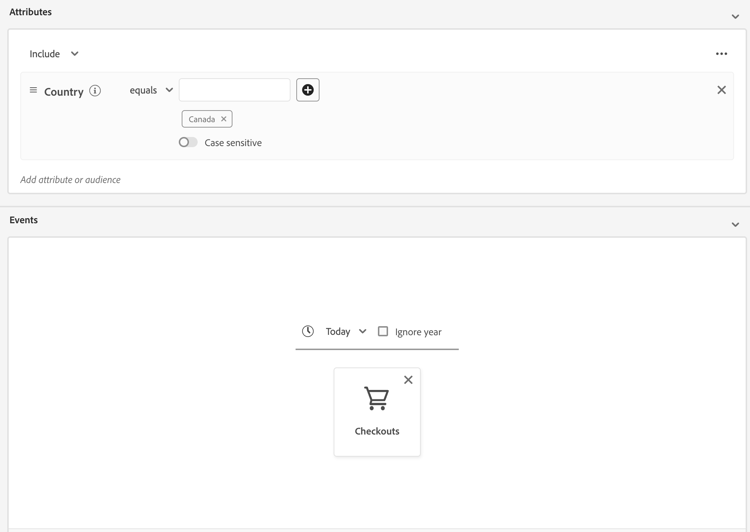 workAddress.country.equals("US", false) and CHAIN(xEvent, timestamp, [C0: WHAT(eventType.equals("commerce.checkouts", false)) WHEN(today)])