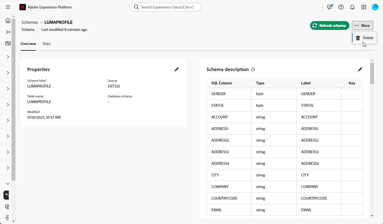 Las tablas de una base de datos federada se pueden actualizar, agregar o quitar. En estos casos, debe actualizar el esquema en Adobe Experience Platform para alinearlo con los cambios más recientes. Para ello, seleccione el