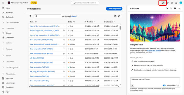 El Asistente de IA es una función de interfaz de usuario concebida para ayudarle a navegar y comprender los conceptos de Adobe. Está disponible para casos de uso de conocimiento del producto en varios productos de Adobe Experience Cloud, incluida la composición de público federado.