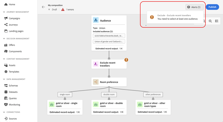 Una vez que la composición esté lista, haga clic en el botón Publicar para publicar la composición y guardar las audiencias resultantes en Adobe Experience Platform.