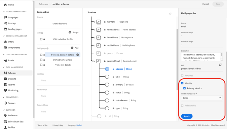 En el panel derecho de Propiedades del campo, compruebe las opciones Identidad e Identidad principal y seleccione un área de nombres. Si desea que la identidad principal sea una dirección de correo electrónico, elija el área de nombres Correo electrónico. Haga clic en Aplicar.