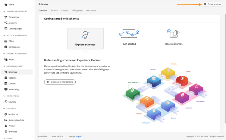 Para crear perfiles, primero debe crear un esquema y un conjunto de datos en Adobe Journey Optimizer.