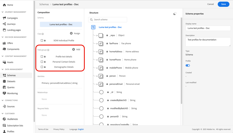 Una vez finalizado, haga clic en Agregar grupos de campos: la lista de grupos de campos se muestra en la pantalla de información general del esquema.