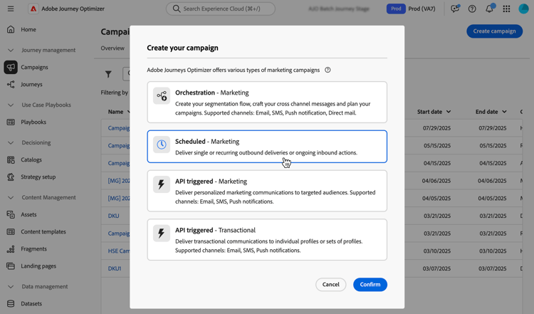 Haga clic en el botón Crear campaña y seleccione el tipo de campaña Programada - Marketing.