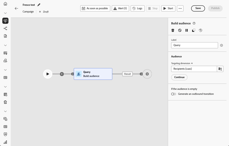 Para ello, use la actividad de segmentación Generar público. Esta actividad define la audiencia que entra en la campaña orquestada. Al enviar mensajes como parte de una campaña orquestada, la audiencia se define en la actividad Generar audiencia, no dentro de la campaña orquestada.