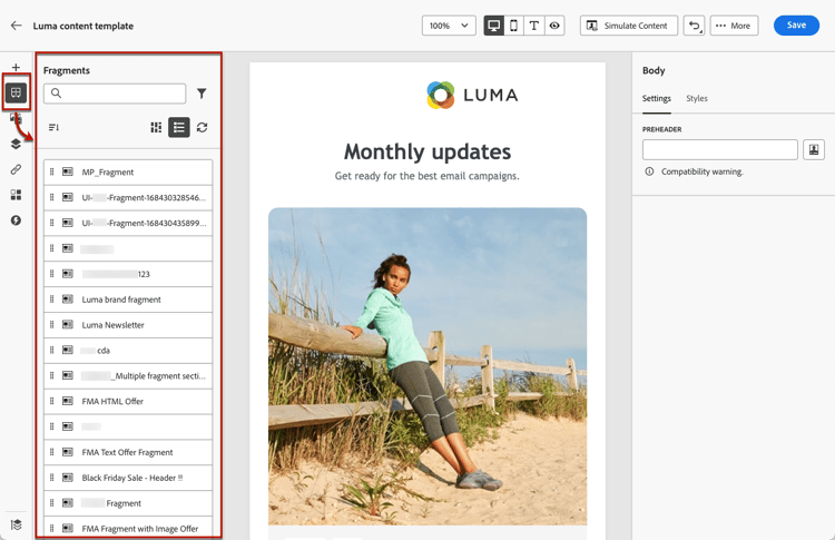 Un fragmento es un componente reutilizable al que se puede hacer referencia en uno o varios correos electrónicos en campañas de Journey Optimizer, recorridos o plantillas de contenido. Esta funcionalidad permite crear previamente varios bloques de contenido personalizados que los usuarios de marketing pueden utilizar para ensamblar rápidamente el contenido del correo electrónico en un proceso de diseño mejorado. Aprenda a crear y administrar fragmentos.