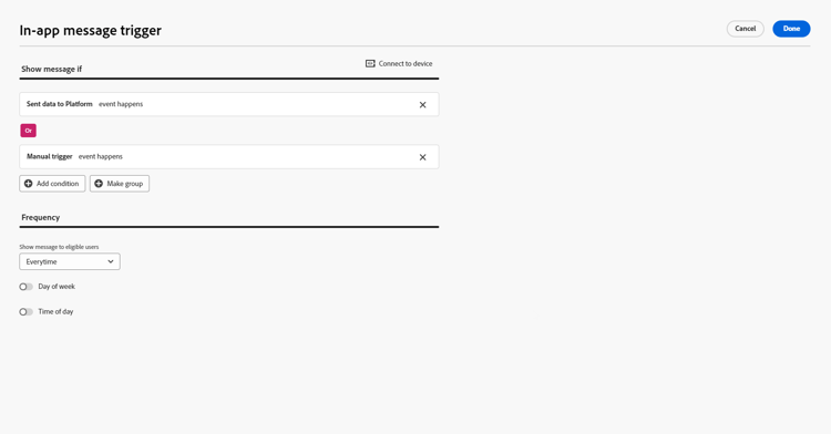 Elija la frecuencia del déclencheur cuando su mensaje en la aplicación esté activo. Las opciones disponibles son las siguientes: