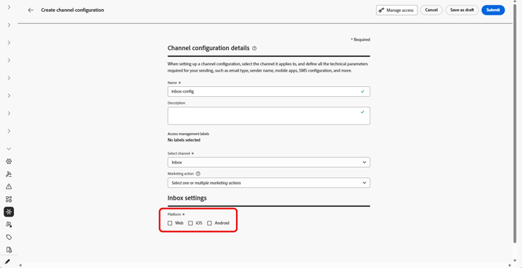 Para poder entregar experiencias de tarjeta de contenido a través de la Bandeja de entrada, debe definir una configuración de canal Bandeja de entrada en Configuraciones de canal. Esa configuración vincula la superficie con el consentimiento, las etiquetas de acceso opcionales y dónde aparece la experiencia en la web o en la aplicación de iOS o Android. Siga los pasos a continuación para crear una configuración: