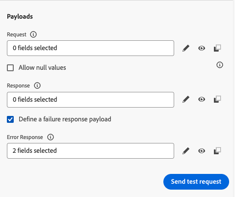 (Opcional) Seleccione Definir una carga útil de respuesta de error para habilitar el campo de carga útil de respuesta de error. Cuando esté habilitada, use la sección Respuesta al error para pegar un ejemplo de la carga útil devuelta cuando falle la llamada. Se aplican los mismos requisitos que para la carga útil de respuesta (tipos de campo y formato). Aprenda a aprovechar la carga de respuesta a errores en los recorridos aquí.