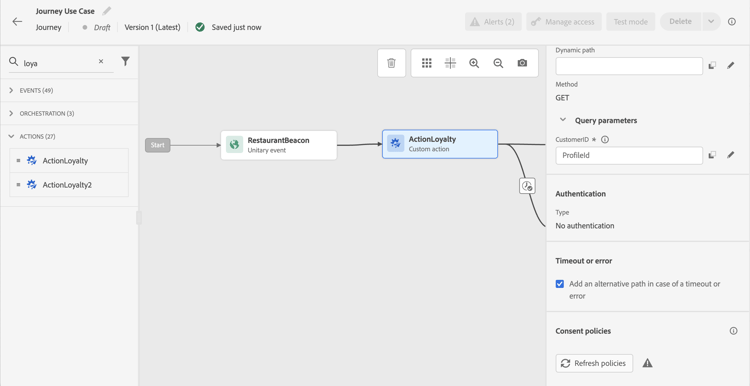En la acción personalizada Fidelidad, asigne el parámetro de consulta ID de cliente con el ID de perfil. Marque la opción Agregar una ruta alternativa en caso de tiempo de espera o error.