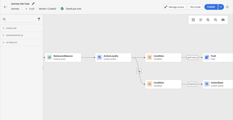 Por ejemplo, puede agregar una condición para comprobar la cantidad de puntos de lealtad. Cuando la persona entra en el restaurante, el punto final local envía una llamada con la información de fidelidad del perfil. Puede enviar una notificación push si el perfil es un cliente de oro. Y si se detecta un error en la llamada de, envíe una acción personalizada para notificarlo al administrador del sistema.