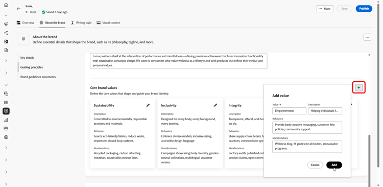 Use la ficha Acerca de la marca para establecer la identidad central de su marca, y delinear su propósito, personalidad, eslogan y otros atributos que la definen.