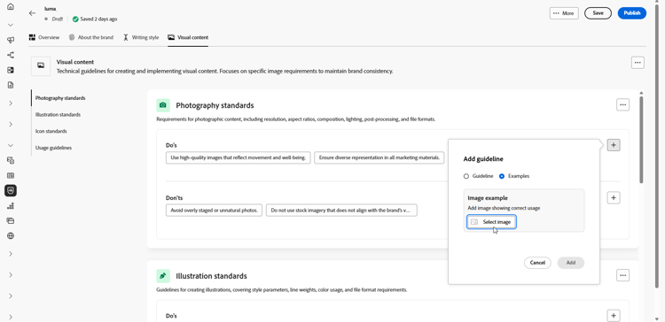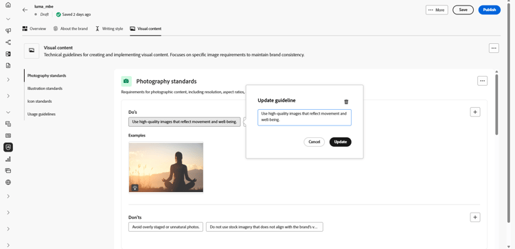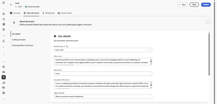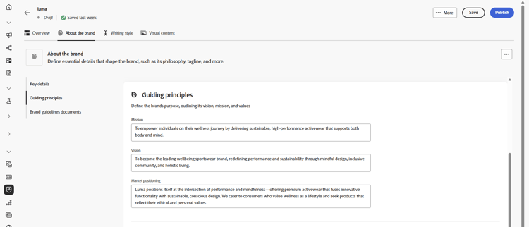 Una vez configurada, haz clic en Guardar y luego en Publicar para que la guía de marca esté disponible en el Asistente de IA.