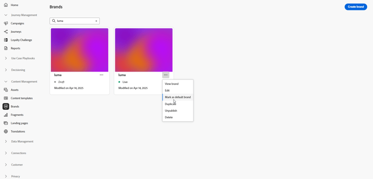 Para acceder al menú de Marcas en Adobe Journey Optimizer, los usuarios deben recibir los permisos de Administrar kit de marca o Habilitar el asistente de IA. Más información