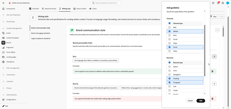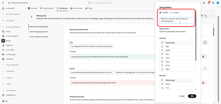 Tipo de canal: elija dónde se debe aplicar esta directriz, excepción o exclusión. Por ejemplo, es posible que desee que un estilo de escritura específico aparezca solo en correos electrónicos, móviles, impresiones u otros canales de comunicación.