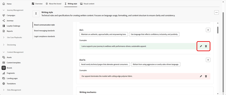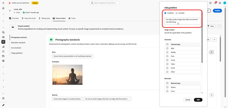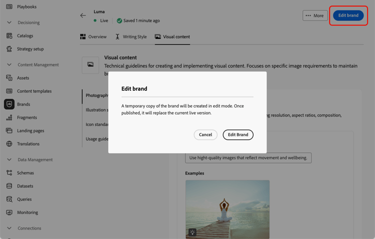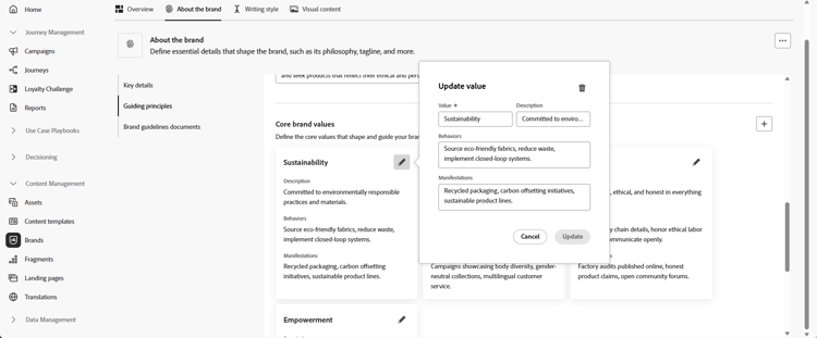 En Journey Optimizer, ahora tiene la opción de introducir y organizar manualmente los detalles de marca o cargar documentos de directrices de marca para la extracción automática de información.