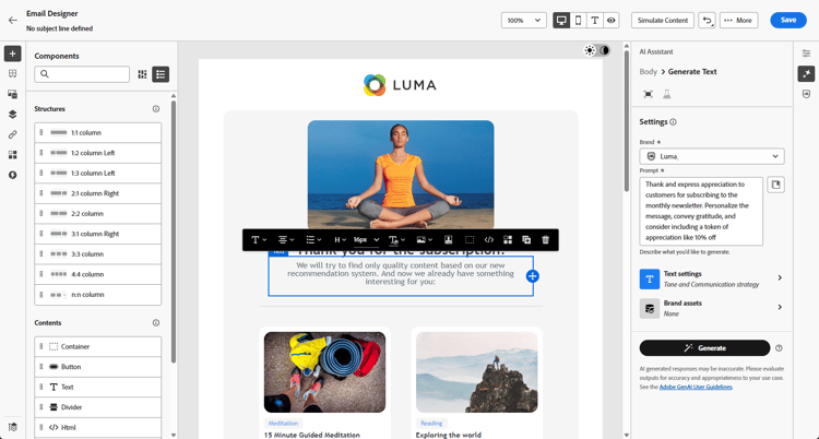 Una vez que haya creado y personalizado sus mensajes, eleve su contenido con AI Assistant en Adobe Journey Optimizer, que incluye la función Experimento de contenido. Esta herramienta le permite definir varios tratamientos de entrega, con contenido variable, para medir el rendimiento de la audiencia de destino.