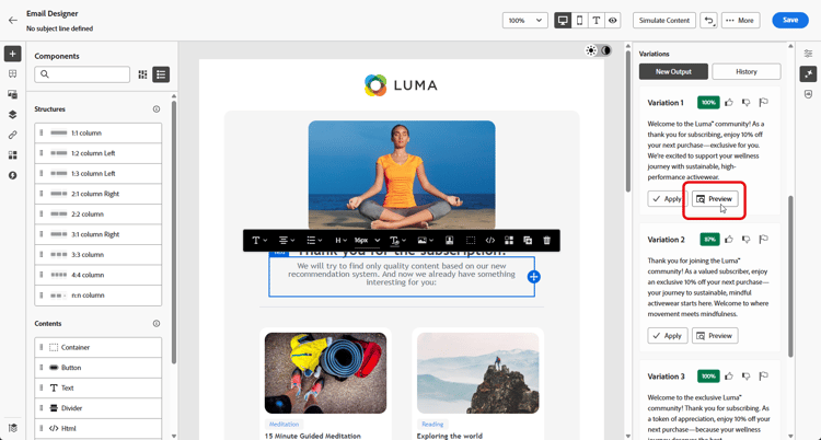 Examine las variaciones generadas y haga clic en Vista previa para ver una versión en pantalla completa de la variación seleccionada.