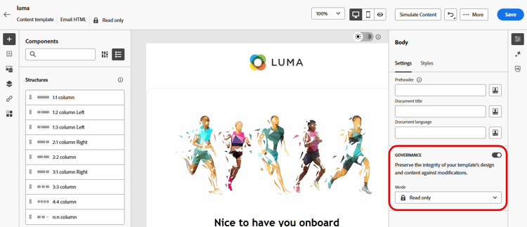 Puede ajustar la configuración de Governance en cualquier momento al diseñar la plantilla seleccionando el cuerpo de la plantilla. Para ello, haga clic en el vínculo Cuerpo en el carril de navegación ubicado en la parte superior del panel lateral derecho.