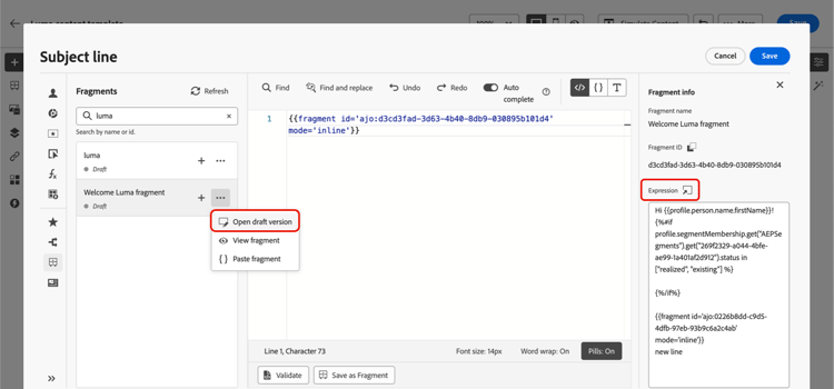 Una vez agregado el ID del fragmento, si abre el fragmento de expresión correspondiente y lo edita desde la interfaz, los cambios se sincronizarán. Se propagan automáticamente a todos los recorridos o campañas en borrador o activos que contengan ese ID de fragmento.