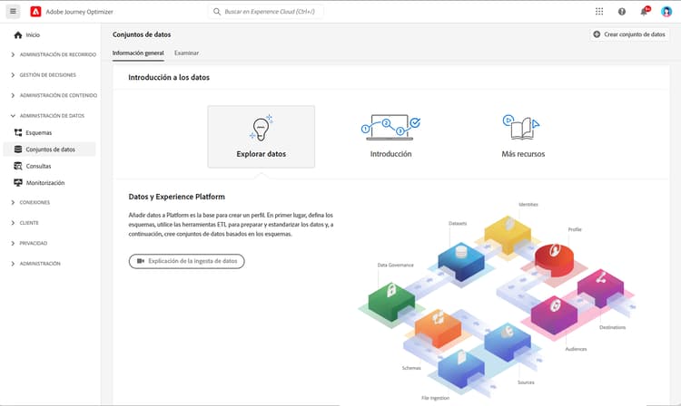 El espacio de trabajo Conjuntos de datos en la interfaz de usuario de Adobe Journey Optimizer le permite explorar datos y crear conjuntos de datos. Para abrir el panel de control Conjuntos de datos, seleccione Conjuntos de datos en el panel de navegación izquierdo.
