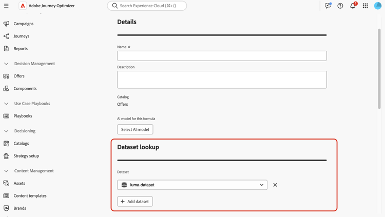 Para utilizar atributos de Adobe Experience Platform para la toma de decisiones, debe crear una asignación para definir cómo se une el conjunto de datos de Adobe Experience Platform con los datos de Journey Optimizer. Para ello, siga estos pasos: