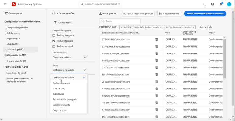 - Una lista de supresión consiste en las direcciones de correo electrónico que desea excluir de las entregas, ya que el envío a estos contactos podría dañar su reputación y las tasas de entrega. Puede monitorizar todas las direcciones de correo electrónico que se excluyen automáticamente del envío de un recorrido. Por ejemplo, direcciones no válidas, direcciones con mensajes devueltos no entregados de forma frecuente y que podrían afectar negativamente a su reputación de correo electrónico y destinatarios que presentan una queja de correo no deseado de algún tipo contra uno de sus mensajes por correo electrónico. Obtenga información sobre cómo administrar la lista de supresión y los reintentos.