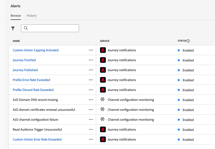 Journey Optimizer proporciona reglas de alerta preconfiguradas que supervisan aspectos específicos de los recorridos y las configuraciones de canal. No es necesario que cree estas alertas: están disponibles de forma predeterminada y se pueden activar mediante suscripción.