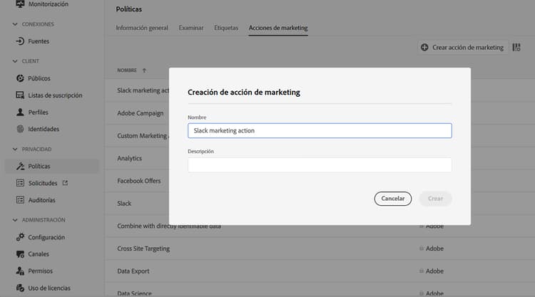 • La Acción de marketing necesaria permite definir la acción de marketing relacionada con la acción personalizada. Por ejemplo, si utiliza esa acción personalizada para enviar correos electrónicos mediante un tercero, puede seleccionar Segmentación por correo electrónico. En el ejemplo, seleccionamos acción de marketing del Slack. Las políticas de gobernanza asociadas a esa acción de marketing se recuperan y aprovechan.